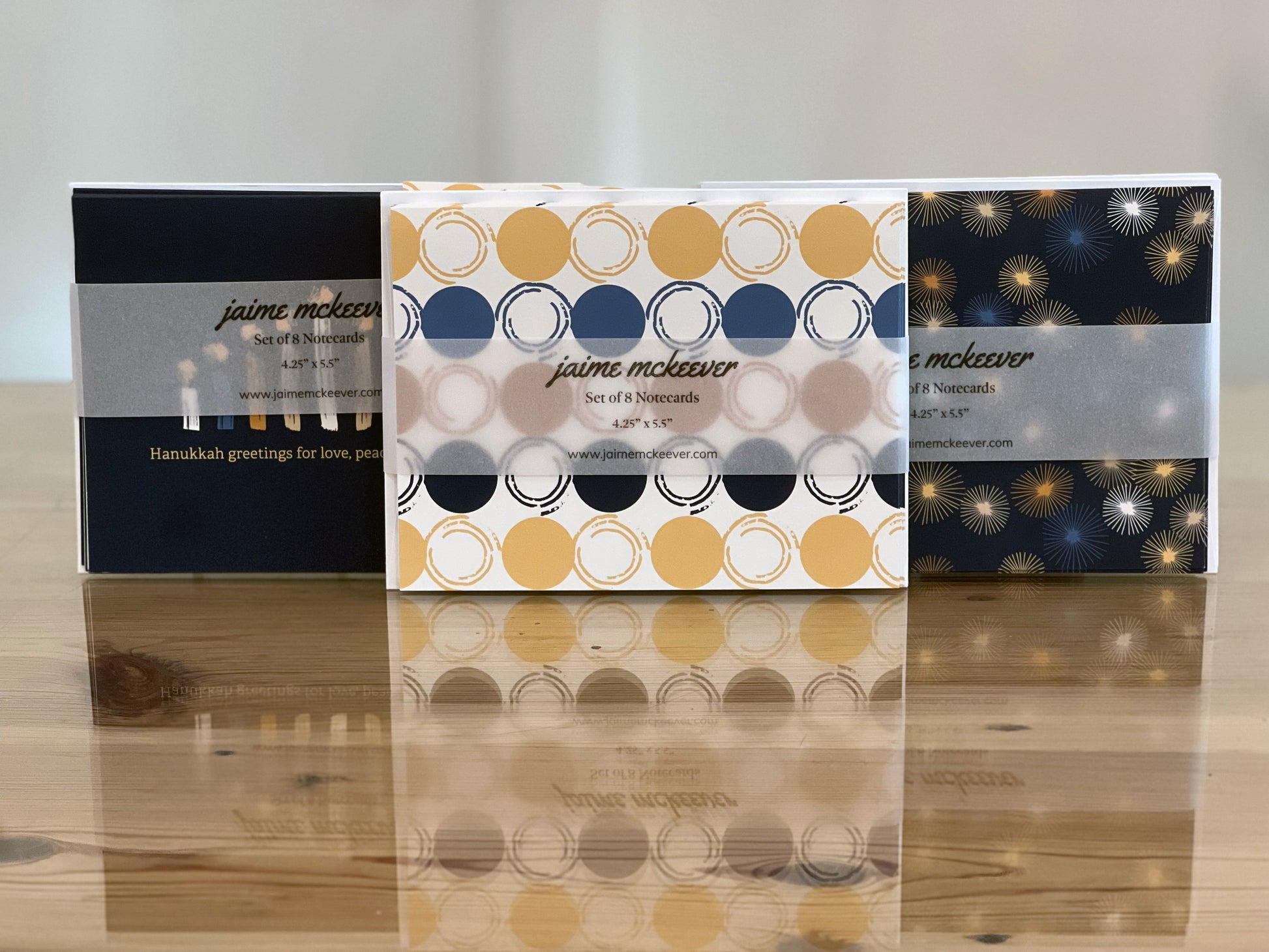 Hanukkah / Light Greeting Notecard Set of 8 – Brush Stroke Design – A2 Cards & White Envelopes – Belly Band Wrapped