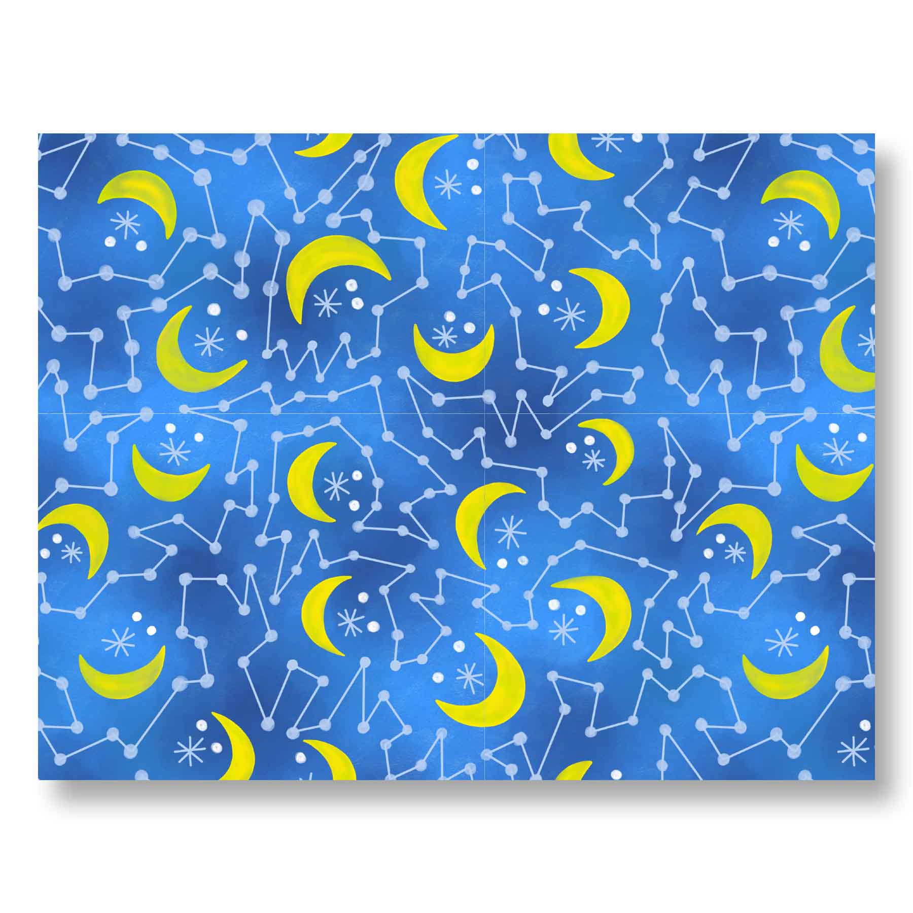 - Design: Artist-designed cover featuring yellow moons, stars, and white constellation lines on a deep blue background