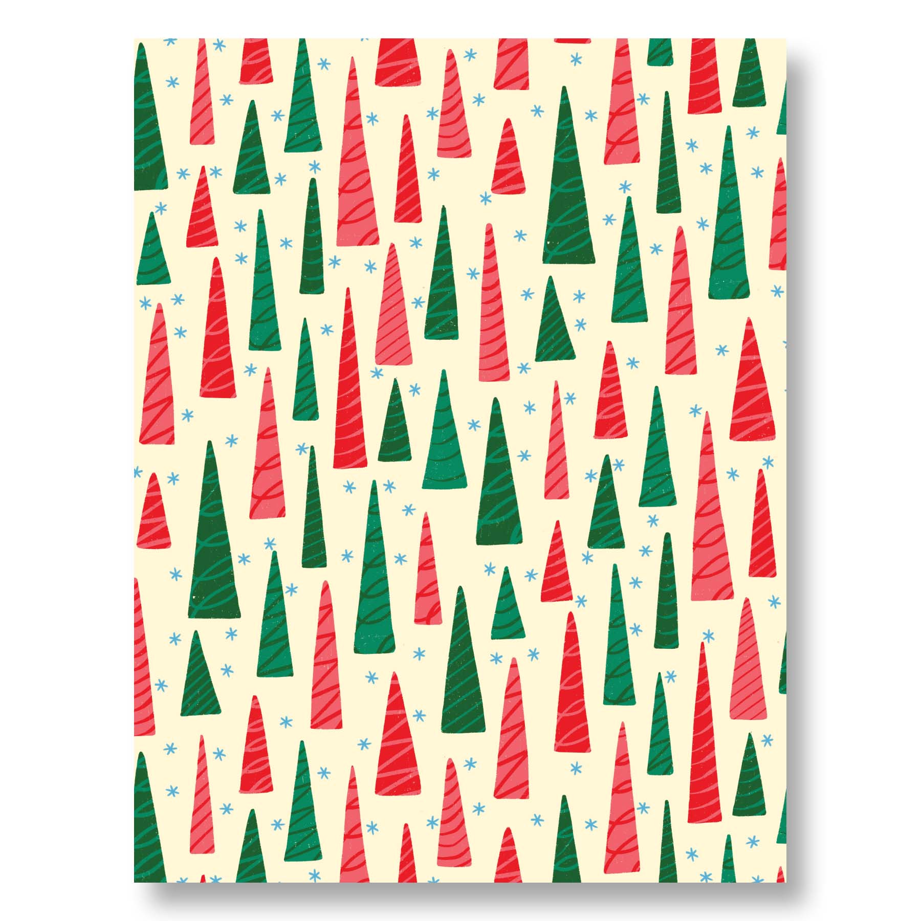 - Design: Repeating triangle tree motif in red/green tones on cream, with small accent snowflakes